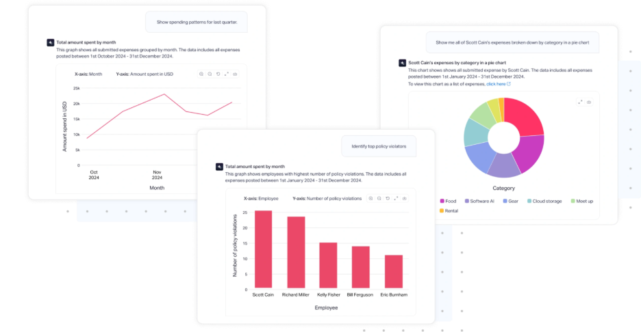 With Sage Expense Management's AI Copilot, you can examine your business credit card and reimbursable spending patterns, compare them across different time frames, and gain valuable AI-driven insights that guide you toward more informed decision-making, all through simple queries.