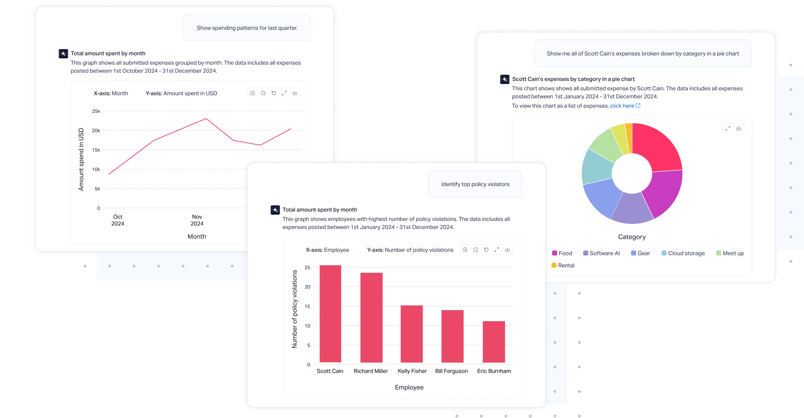 Fyle's CoPilot provides instant, AI-powered insights into all employee credit card expenses. Analyze spending by categories, merchants, projects, employees, or departments, enabling you to: