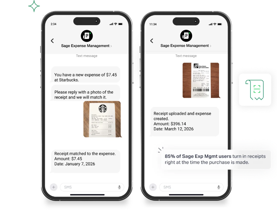 Customer insight: The deskless workers, such as those in field services or construction, are the most likely to delay expense reports. Sage Expense Management solves this by allowing receipt capture via text. By removing the need to log into a complex mobile app, businesses see a significant increase in submission rates from their field staff.