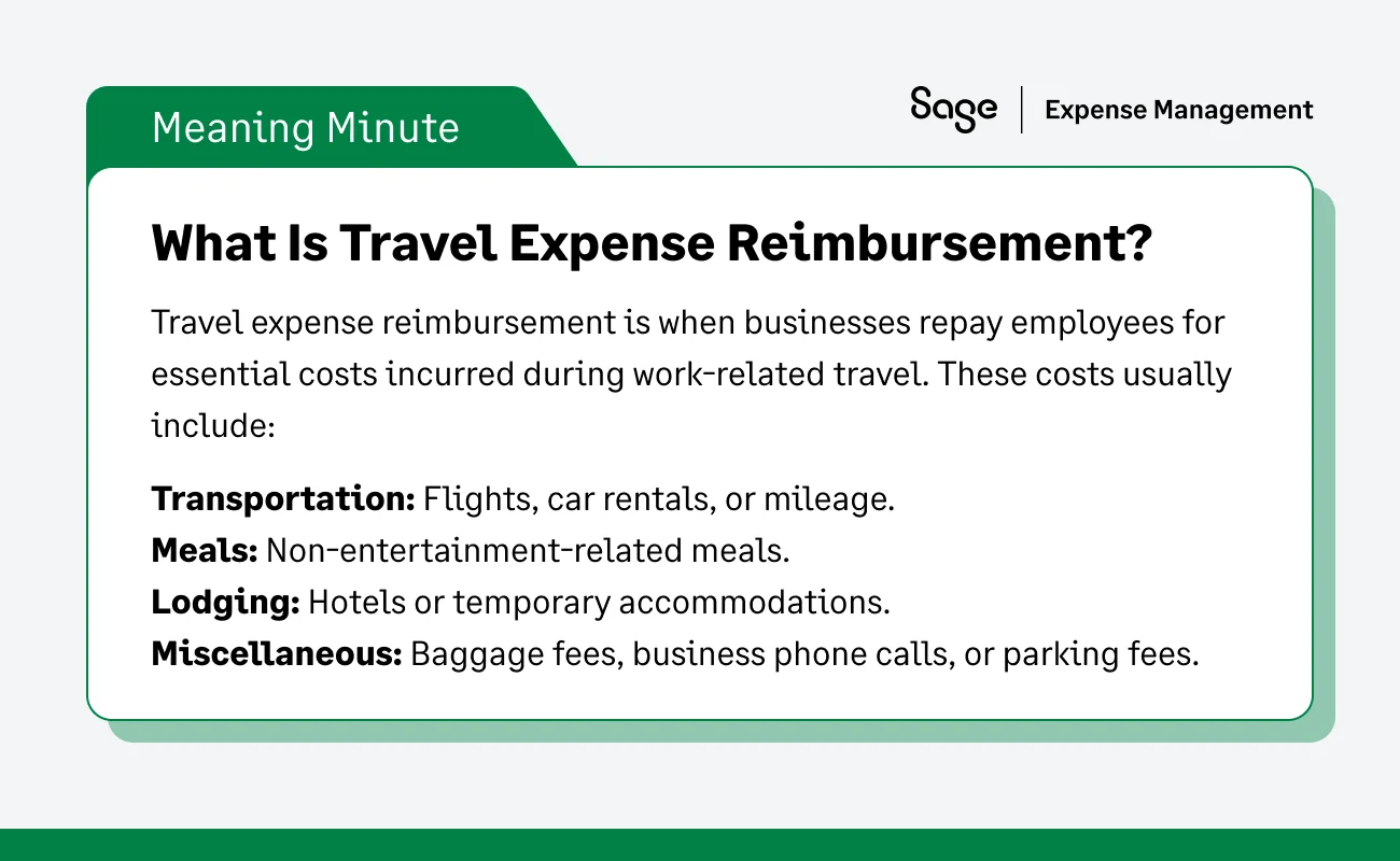 Travel expense reimbursement is the process of compensating employees for reasonable and necessary costs incurred while traveling away from home for work. This typically covers transportation, lodging, and meals.