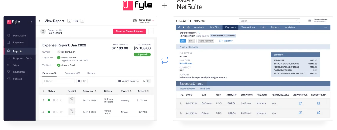 - Automated Data Mapping: Automatically sync employee, vendor, project, and department data from NetSuite, eliminating redundant data entry and ensuring your records are always accurate.
