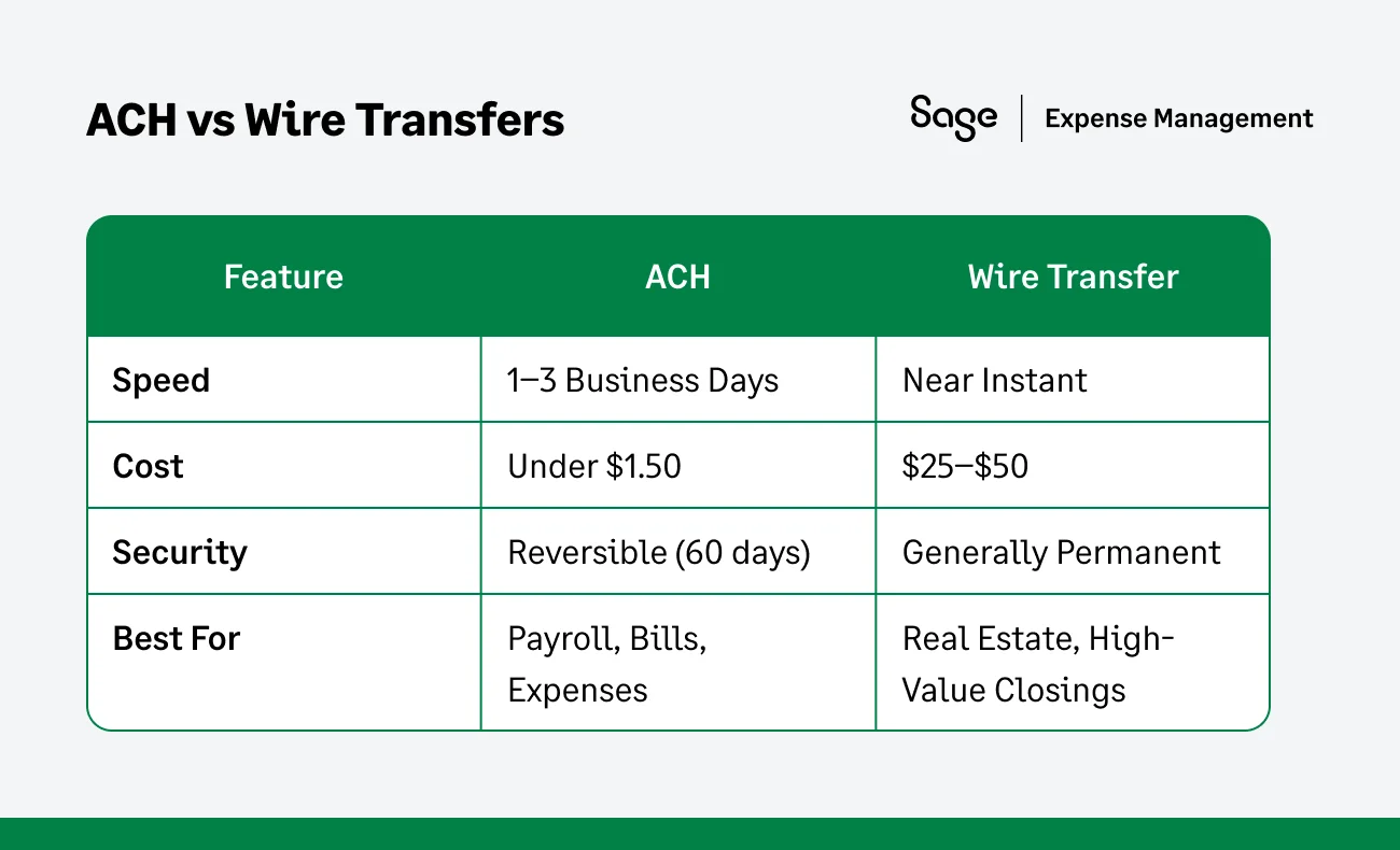 ACH is the "standard shipping" of the financial world. Because it is processed in batches, it costs pennies compared to wires. It is the perfect choice for high-volume, recurring payments like payroll or monthly vendor retainers where a 48-hour delay won't disrupt your operations.